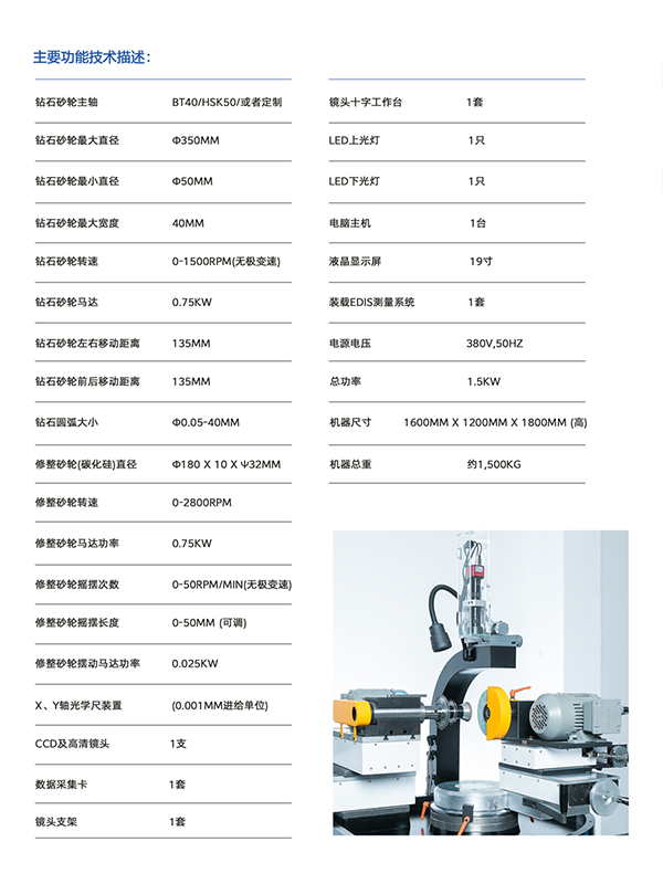 機床主軸砂輪作為被修整的金剛石砂輪或CBN砂輪,附件上所安裝的砂輪作為修整砂輪即綠色碳化硅砂輪;被修整砂輪二個方向可以調整,即X軸、Y軸;修整砂輪有三個方向可以調整,即旋轉A軸、X1軸和Y1軸,并且可以變頻調速的往復擺動,除此之外,X1軸和Y1軸之間可以旋轉和定位,可以實現修整砂輪做180°旋轉;機床配有CCD光學測量系統、光柵尺數顯測量系統、10到100倍之放大系統、液晶顯示器。